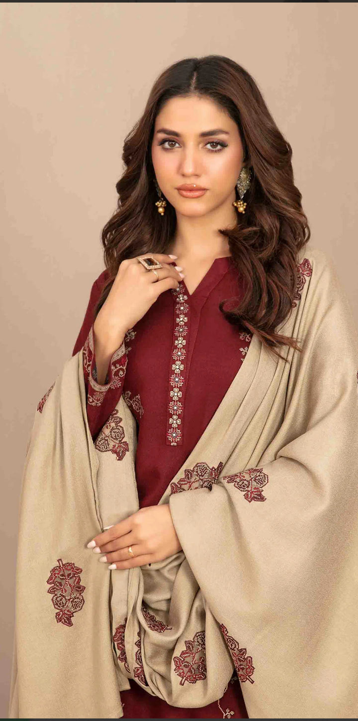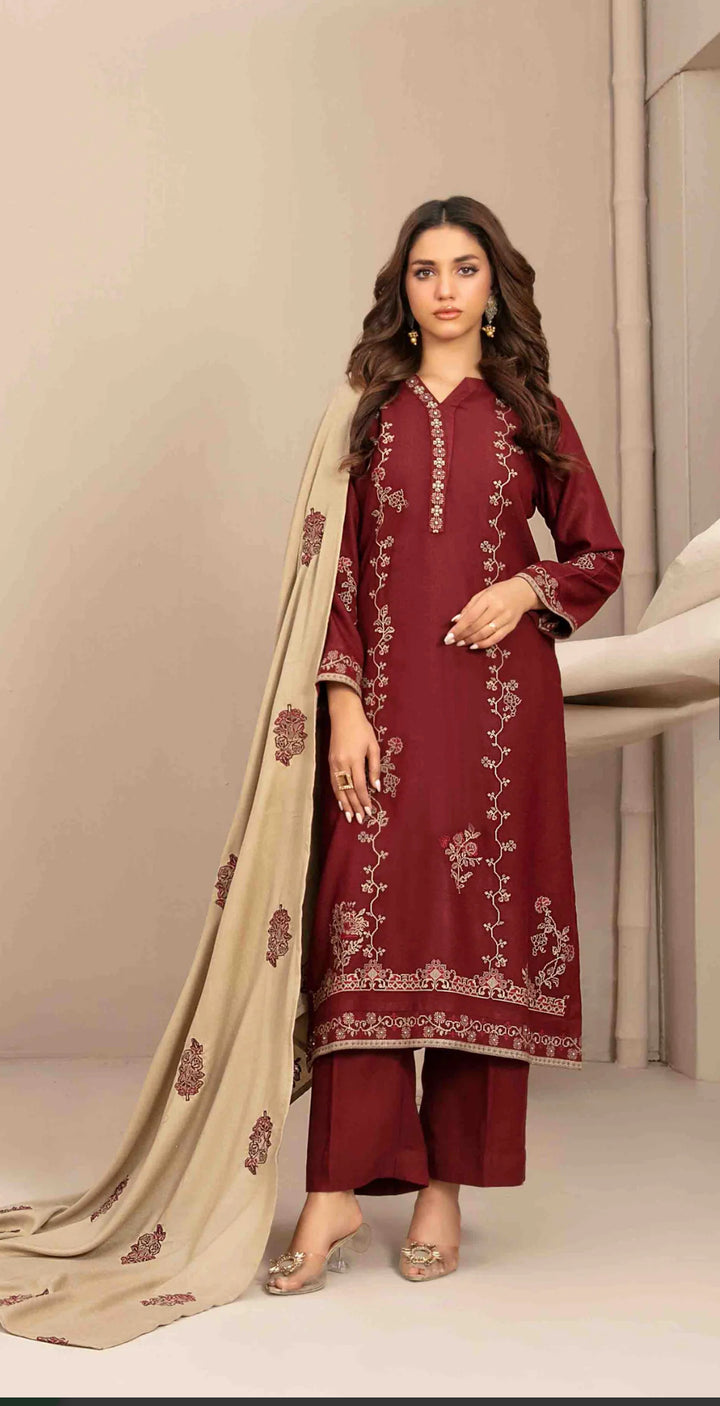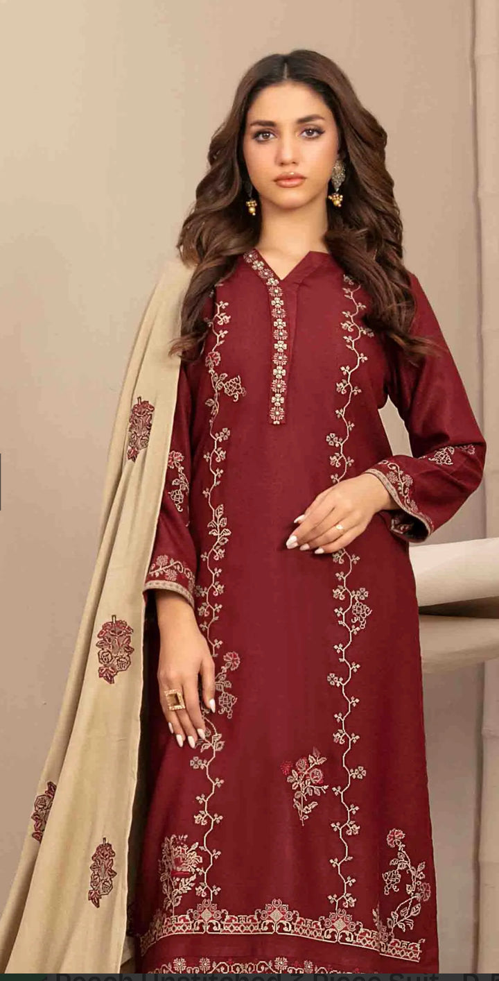 Embroidered Leather Peach Unstitched 3 Piece Suit - D-5685 - TF25SWN - Maroon - Winter Collection