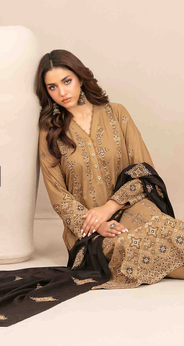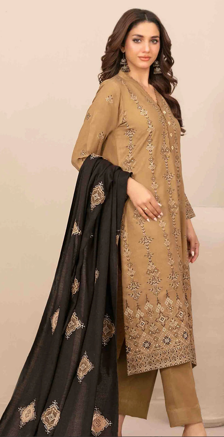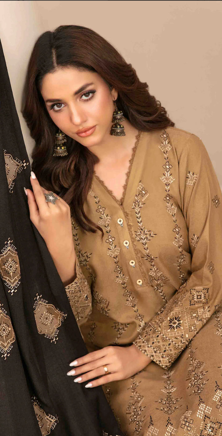 Embroidered Leather Peach Unstitched 3 Piece Suit - D-5690 - TF25SWN - Brown - Winter Collection