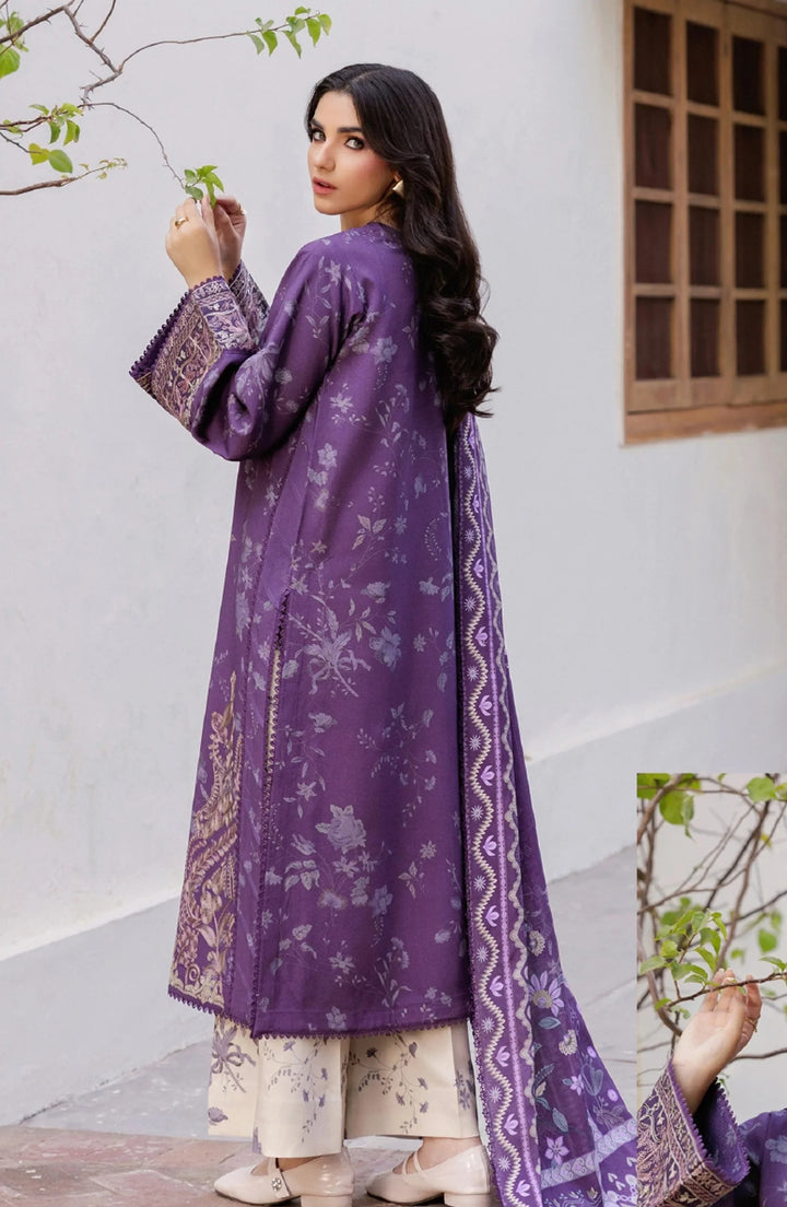 Embroidered 3-Piece Unstitched Suit in stunning purple. Crafted from premium khadi wool and high-quality winter fabrics, this set features a digitally printed embroidered front, back, and sleeves, with intricate embroidered borders on the neckline and hem.