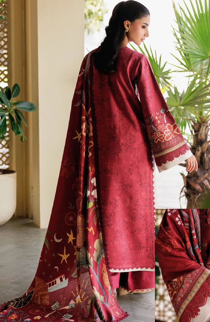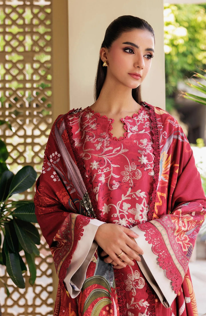 Florent Embroidered 3-Piece Unstitched Suit in vibrant red. Crafted from premium winter fabrics with digitally printed embroidery, this suit features a soft wool shawl and dyed trousers, combining warmth, comfort, and luxury.