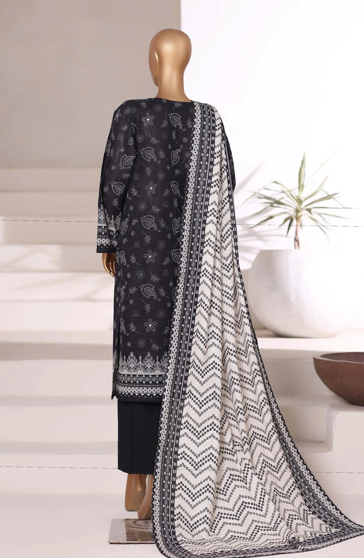 Stay warm and stylish this winter with our Printed Khaddar 3 Piece Suit – (Black).
